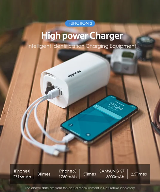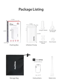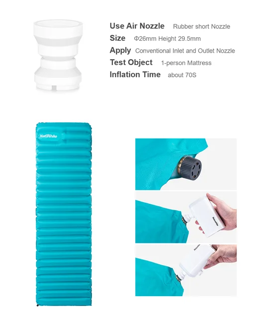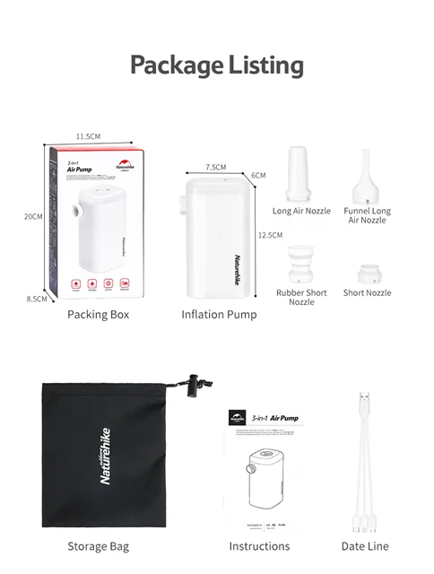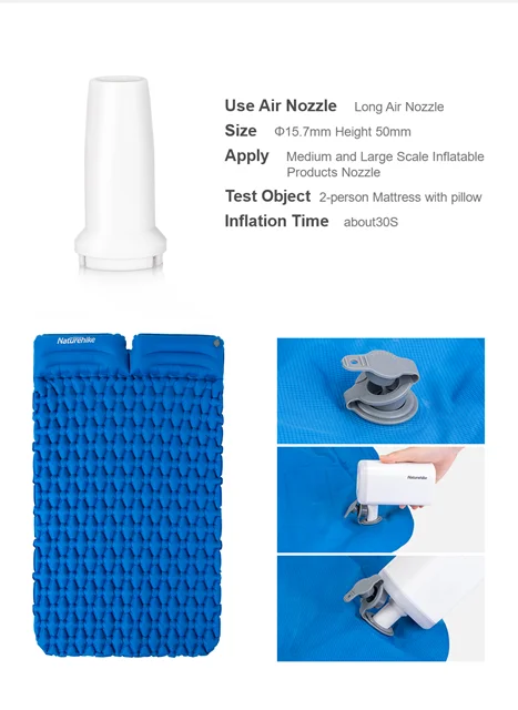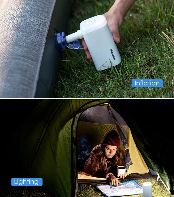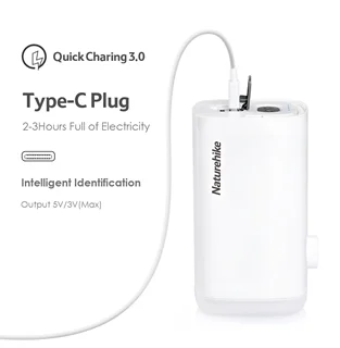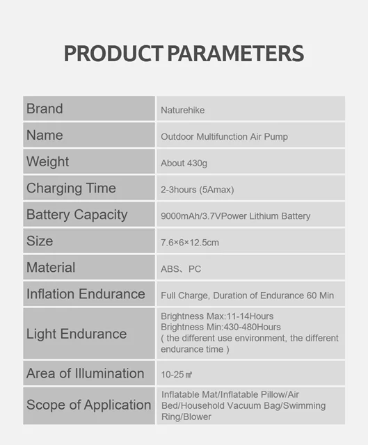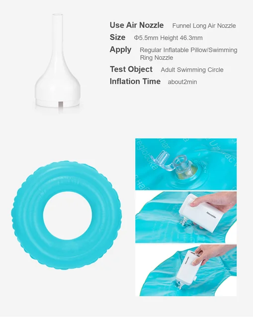 از پمپ باد شارژی نیچرهایک با داشتن چندین نازل برای باد کردن اکثر وسایل بادی همچنین به عنوان چراغ یا پاوربانک استفاده می شود.