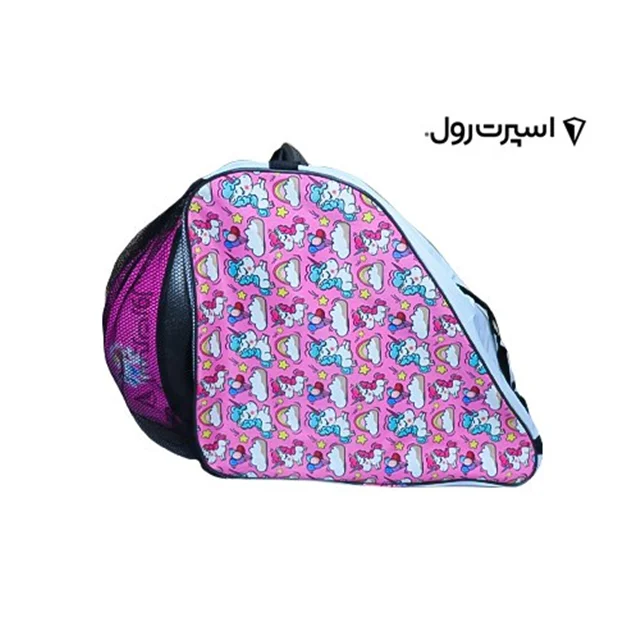 ساک اسکیت دخترانه طرحدار معرفی شده در این قسمت به رنگ صورتی و با طرح پونی تک شاخ به بازارعرضه شده و از جنس پارچه برزنتی دوخته شده است. در ساک اسکیت دو دستگیره جهت حمل و نقل آسان تعبیه شده یکی در قسمت تاج ساک اسکیت و از جنس پلاستیک نرم ساخته شده است و دیگری بند دوشی با قابلیت تنظیم سایز بند ساک اسکیت با قیمت ارزان در فروشگاه اسپرت رول برای شما فراهم شده است. همچنین ساک کفش اسکیت دخترانه دارای محفظه کلاه جداگانه است که ساک را در دسته ساکهای کلاهدار اسکیت دخترانه قرار میدهد .از نظر سایز ساک مناسب یک جفت کفش اسکیت تا سایز 46+ ست ایمنی کامل و محافظ لگن در محفظه اصلی (کلاه نیز جا میشود اما از نطر بهداشتی نبایستی در کنار اسکیت و ست ایمنی باشد) قرار میگیرد و کلاه نیز در محفظه توری پشت ساک کفش اسکیت قرار میگیرد خرید ساک اسکیت دخترانه برای سهولت در جا به جایی و بهداشتی بودن مورد نیاز هر اسکیت سواری است.